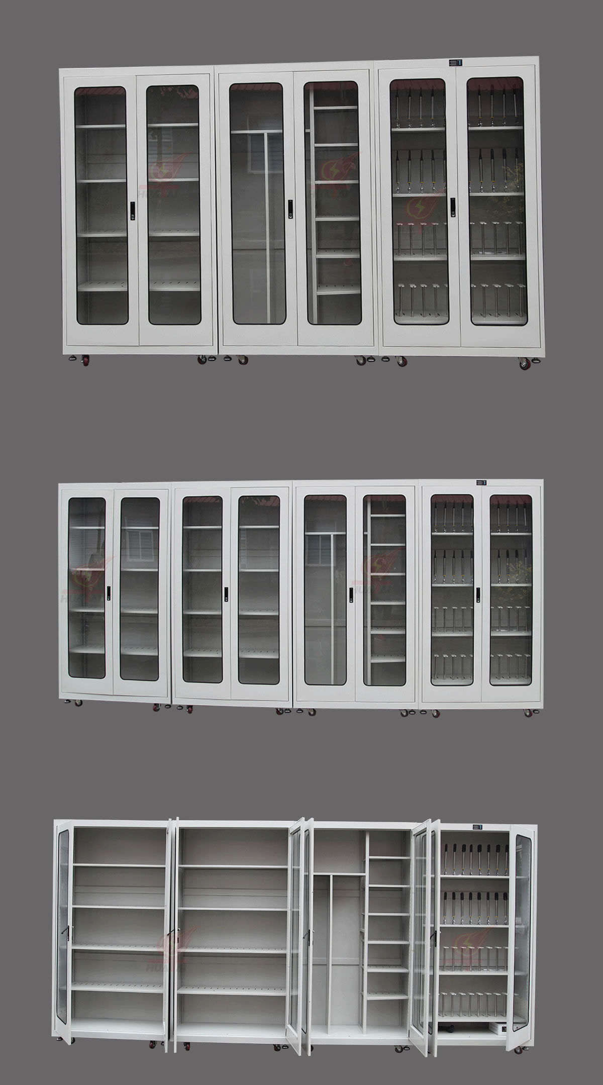 (2)柜體表面為靜電防腐噴塑工藝,顏色為駝灰色,柜門裝有通體透明鋼化玻璃,透過玻璃門可以看到分類有序的各種工器具,便于您的管理。