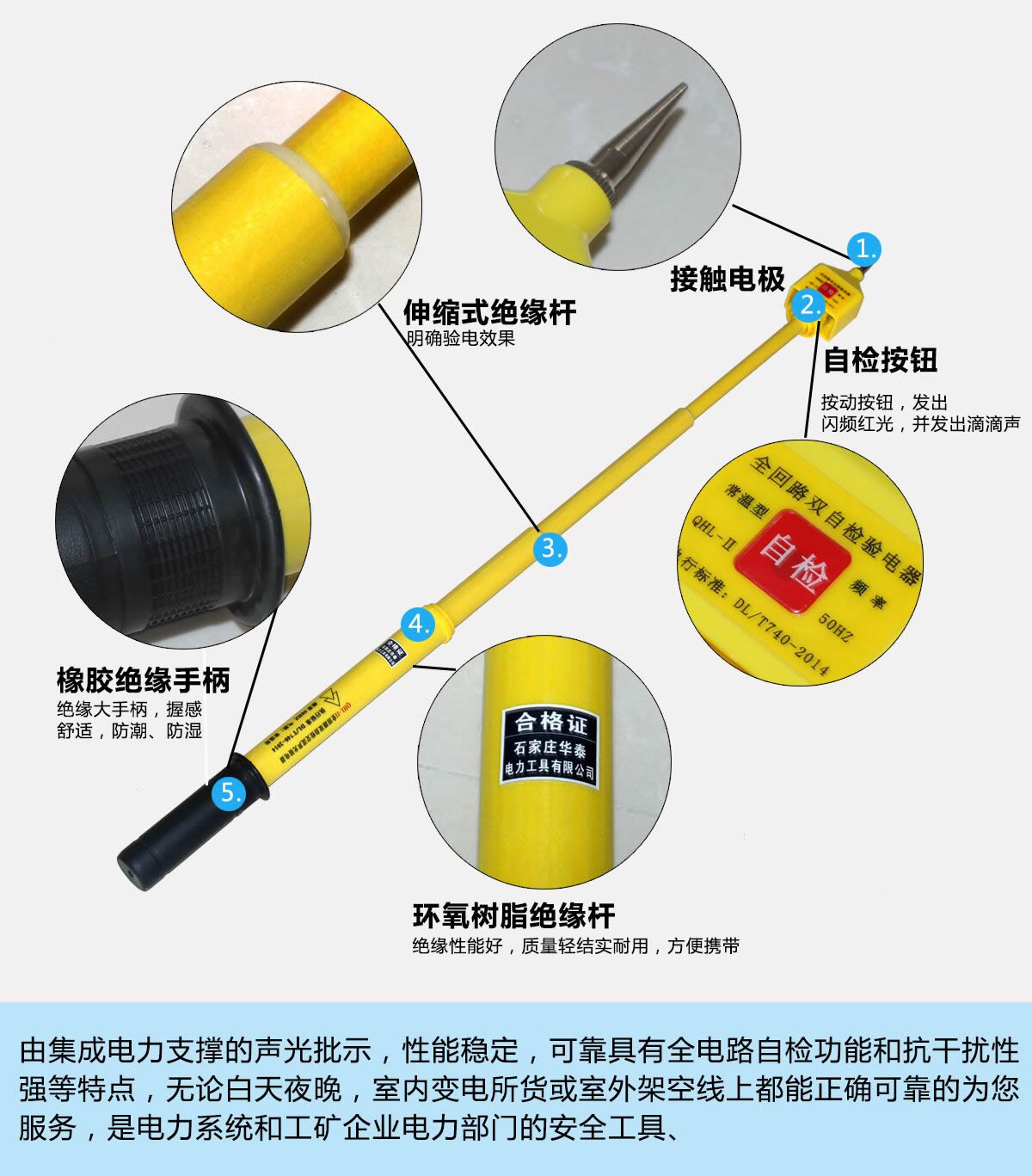 全回路雙自檢交流聲光驗電器是我公司采用國際先進技術和我們雄厚的技術力量以及多年來的制造研究所生產的一款新型交流驗電器,它具有靈敏度高,不受強電場干擾,具有全回路自檢功能,安全系數高,整體采用閉合電路設計,外殼用注塑ABS工程塑料一次成型,桿體延續(xù)棒狀伸縮環(huán)氧樹脂絕緣桿,耐壓等級及安全系數比傳統(tǒng)驗電器提高3倍。