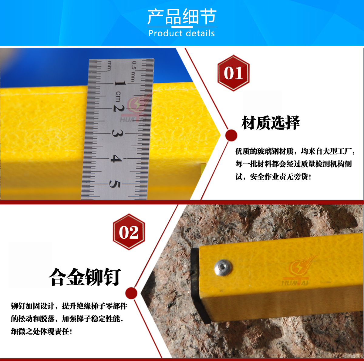 絕緣梯采不飽和樹脂和玻璃纖維聚合拉擠制造工藝,材質(zhì)選用環(huán)氧樹脂結(jié)合銷棒技術(shù),軸類鋼制件表面有防護(hù)鍍層;絕緣層壓類材料制件加工表面用了絕緣漆進(jìn)行處理。