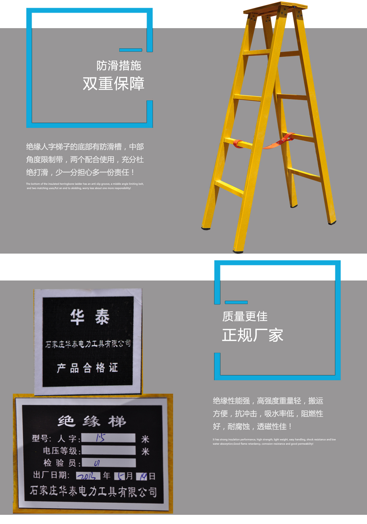 絕緣梯采用不飽和樹脂和玻璃纖維聚合拉擠制造工藝,材質(zhì)選用環(huán)氧樹脂結(jié)合銷棒技術(shù),軸類鋼制件表面有防護鍍層;絕緣層壓類材料制件加工表面用了絕緣漆進行處理。梯撐、梯腳防滑設(shè)計不易疲勞,梯各部件外形無尖銳棱角,安全程度高,絕緣性能強;吸水力低,耐腐蝕。