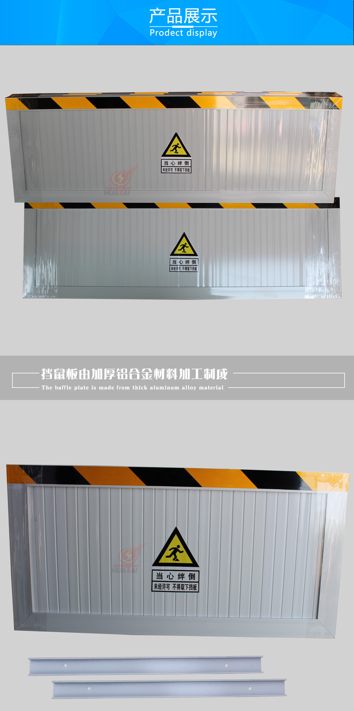 新型鋁合金材質(zhì)擋鼠板替代老式擋鼠板材,實(shí)用、結(jié)實(shí)、耐用、使用時(shí)間長(zhǎng)。由擋鼠板主板面和卡槽夠成,外觀可見(jiàn)部分為鋁合金定制,且貼有黃黑色的反光警示貼。