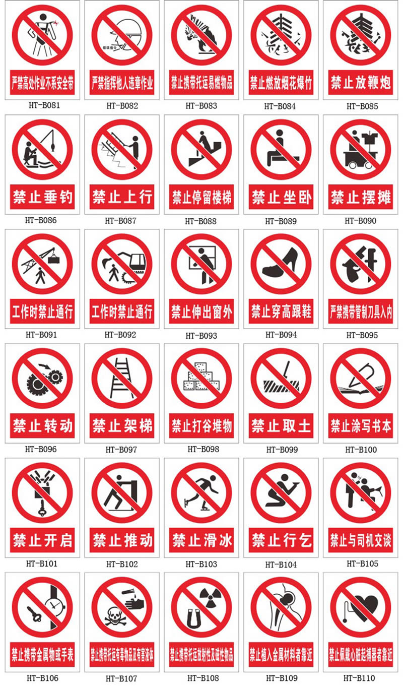 3.禁令類PVC材質安全警示牌:通常為圓形,白底紅邊,紅斜杠黑色圖案。是根據(jù)街道、公路和交通量情況對車輛加以禁止或適當限制的標志。如禁止通行、禁止停車、限制速度、限制重量、限制寬度等。