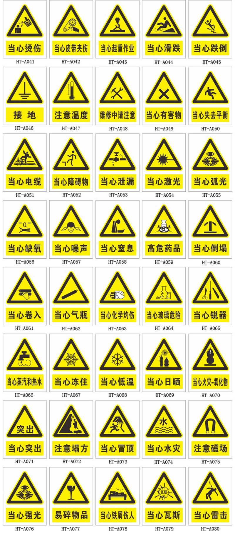 2.警告類PVC材質(zhì)安全警示牌:通常為等邊三角形(或菱形),黃(白)底黑(紅)邊,黑色(或深藍(lán)色)圖案。用于警告駕駛?cè)藛T注意前方路段存在的危險(xiǎn)和必須采取的措施。如預(yù)告交叉口、道路轉(zhuǎn)彎、鐵路道口、易滑路段、可能落石路段、不平路面、合流交通等。