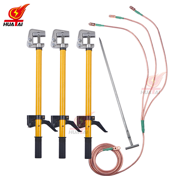 (2)110KV黃色手拉式接地線安裝:將接地軟銅線分相上雙眼銅鼻子固定在接地棒上的接電夾(接電夾有固定式和活動式)相應(yīng)位置上,將接地線合相上的單眼銅鼻子固定在接地夾或地針上,構(gòu)成一套完整的接地線。