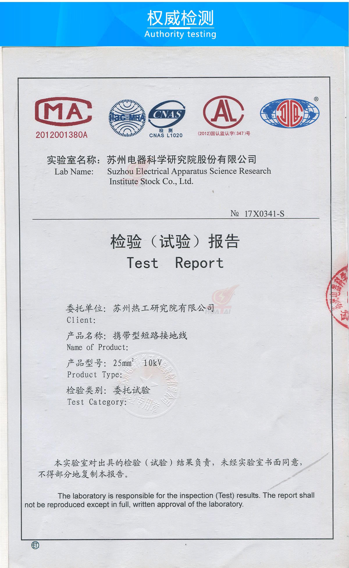 (2)35KV黃色手拉式接地線 標(biāo)稱截面:25mm2 總根數(shù):810 平均直徑(mm):0.2mm 計算截面:(mm2):25.43 金屬接頭部分長度:50 mm 節(jié)數(shù):1 桿徑:30mm